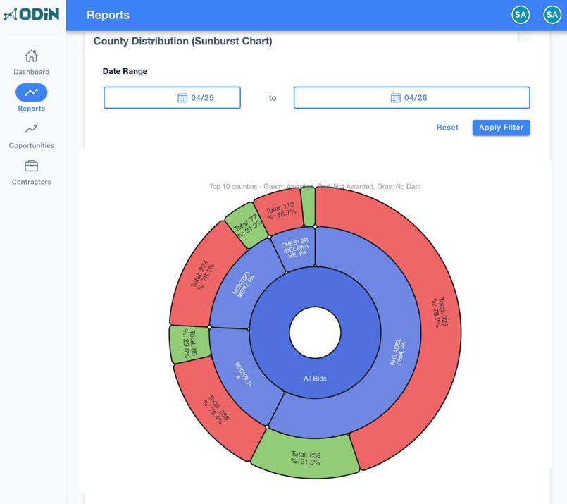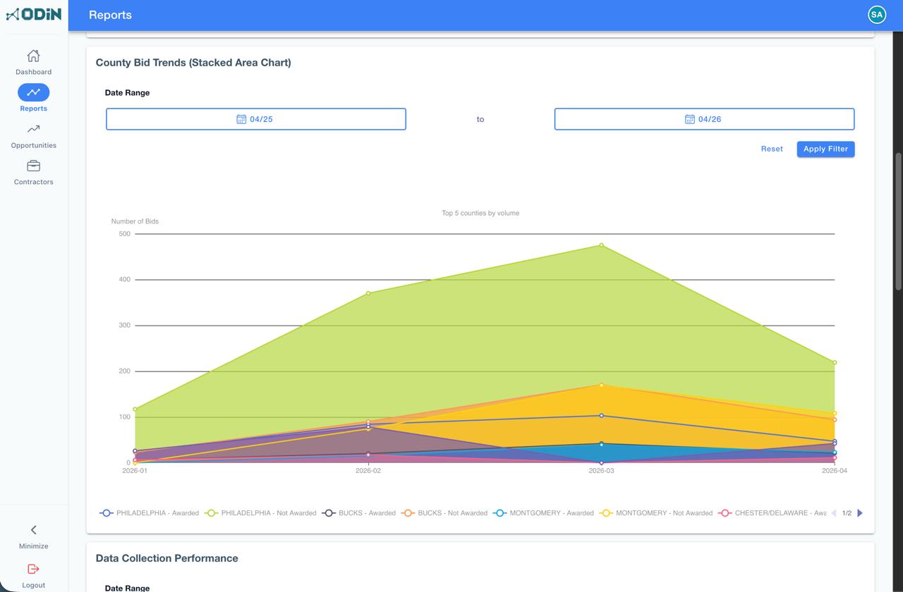 ODIN's dashboard shows you bidding activity, available jobs, work in progress, and completed projects. You see everything at once. No more hunting through spreadsheets or Dodge reports.